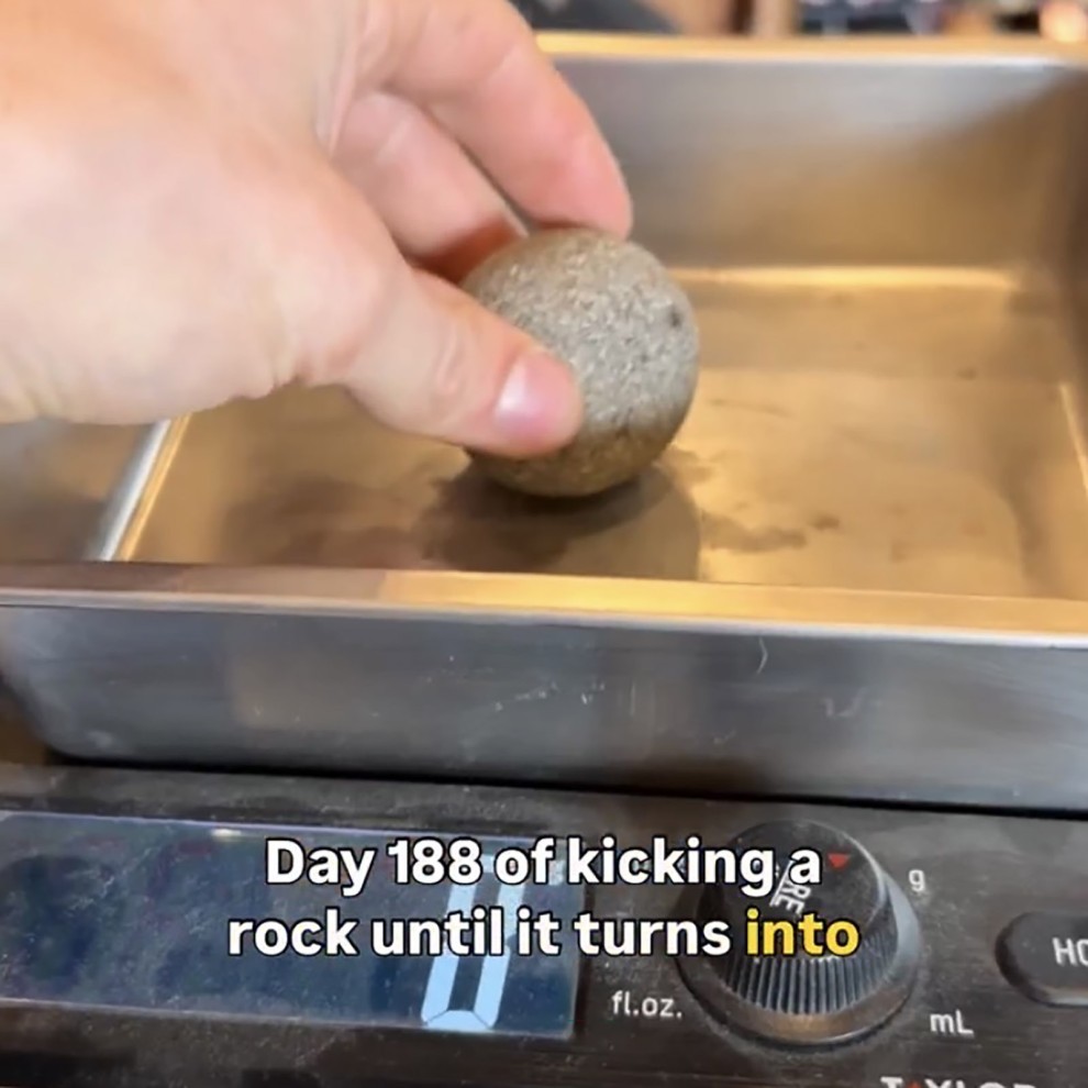 PHOTO: In this still image of an Instagram reel, Christosphere, the formerlly-two-pound rock that Shirtzenpantz co-owner Owen Gail is kicking every day until it becomes spherical, is weighed on the 188th day of the project. (Shirtzenpantz via Instagram)