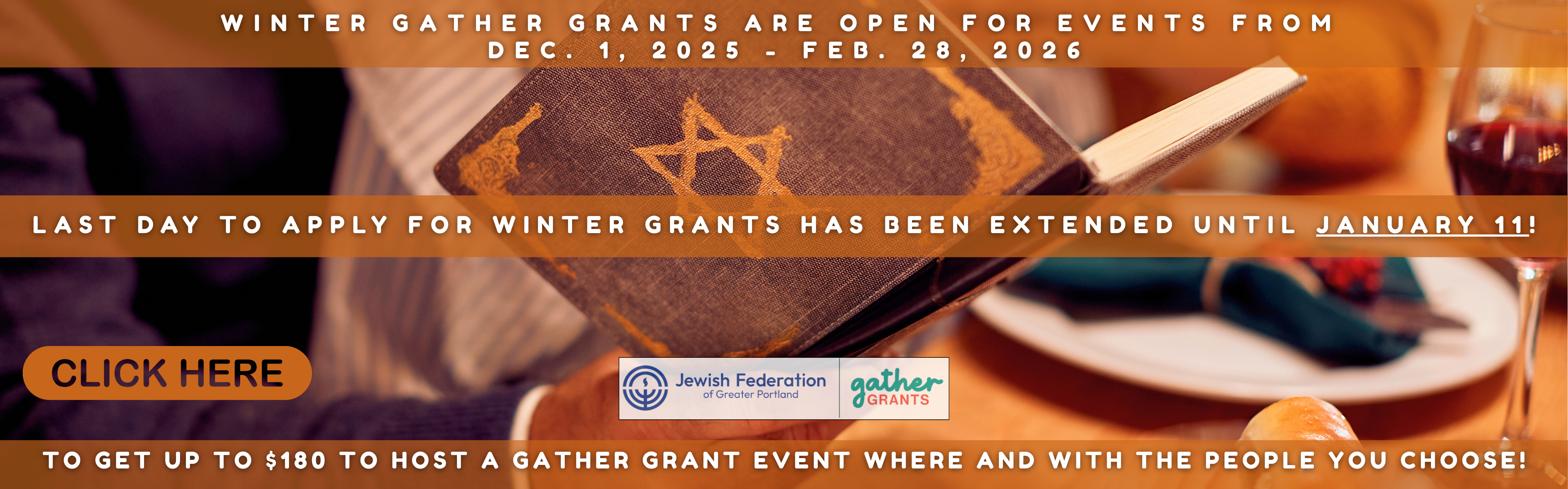 The deadline for applications for WINTER Gather Grants HAS BEEN EXTENDED UNTIL JANUARY 11! Build your community. Strengthen your connections. Do Judaism your way. Click the image above for additional information and to apply!