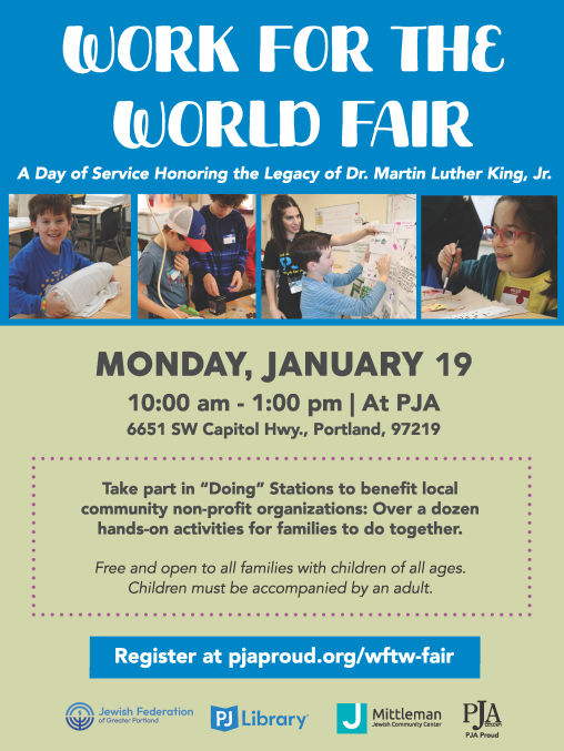 Work for the World Fair - Monday, January 19, 2026. Join us for a day of service, honoring the legacy of Dr. Martin Luther King, Jr. Free and open to all families with children of all ages. Click the image above to RSVP!