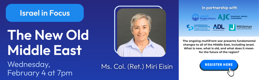 The New Old Middle East : A Talk with Ms. Colonel (Ret.) Miri Eisen. Wed., Feb. 4 | 7 - 8:30 PM @ Mittleman Jewish Community Center. The ongoing war presents changes to the Middle East, including Israel. What does it mean for the future of the region?