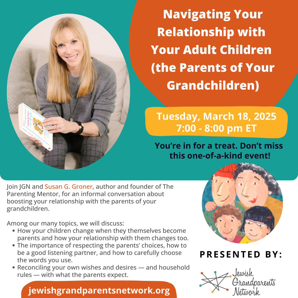 Join the Jewish Grandparents Network and Susan G. Groner, author and founder of The Parenting Mentor, for an informal conversation about boosting your relationship with the parents of your grandchildren.
