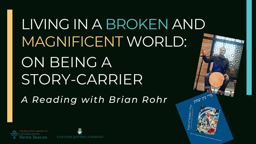 What stories do we carry? How do we use stories in our lives? Storyteller Brian Rohr will read his essay “On Being a Story-Carrier” recently published in the new two-volume book set, P’ri Etz Yitzhak, Fruit of Yitzhak’s Tree, created in memory of influential storyteller and teacher Maggid Yitzhak Buxbaum, z”l. The book set contains over 600 pages of essays, stories, and original art all on the theme and practice of Jewish Storytelling. Rohr’s essay specifically explores what it means to be a “story-carrier” – something that each of us already are – and the importance of being conscious of which stories we choose to carry. There will be time for a Q&A after the reading of the essay. Wine and light snacks will be served.