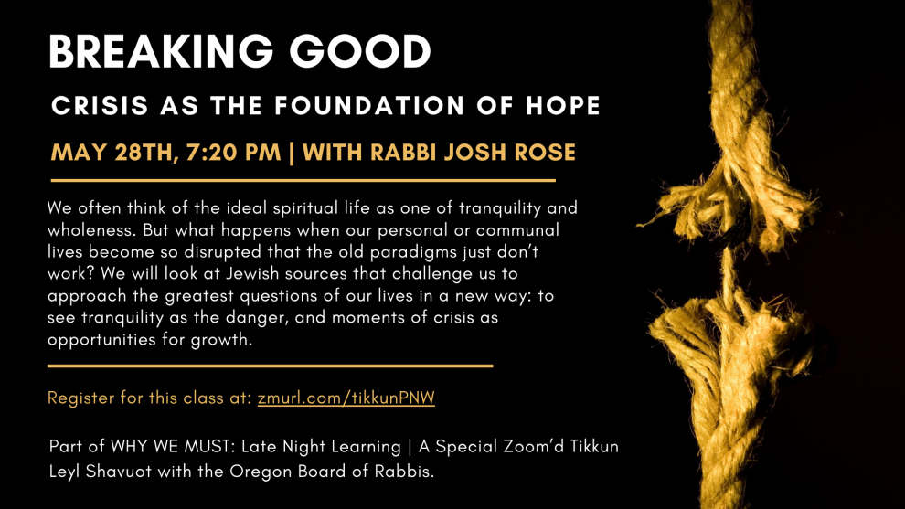 We often think of the ideal spiritual life as one of tranquility and wholeness. But what happens when our personal or communal lives become so disrupted that the old paradigms just don’t work? When we are shattered and confused, how can we make sense of the world? We will look at Jewish sources that challenge us to approach the greatest questions of our lives in a new way: to see tranquility as the danger, and moments of crisis as opportunities for growth.