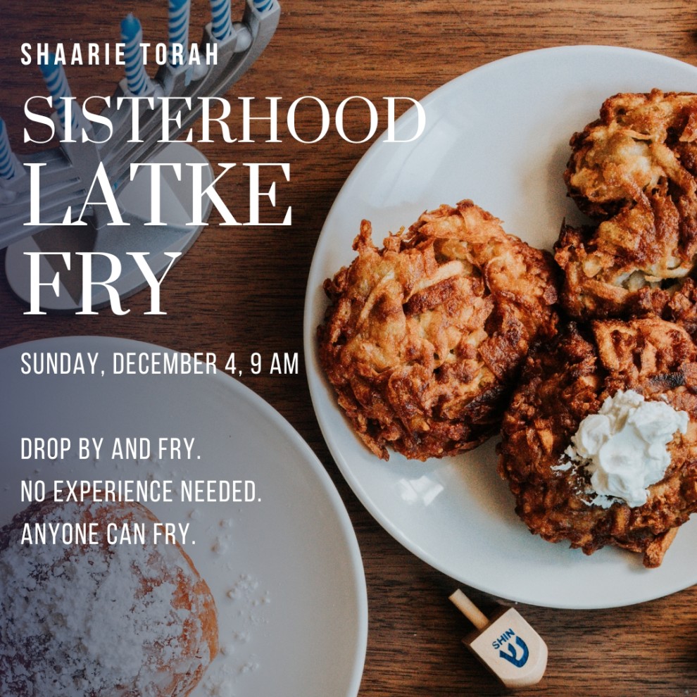 Please come and make Latkes with your Sisterhood friends! We’re starting at 9am and will work till we are done, and hopefully finish around 1pm. Come anytime you want, even if it’s just for 1hour. We’ll find you a job.