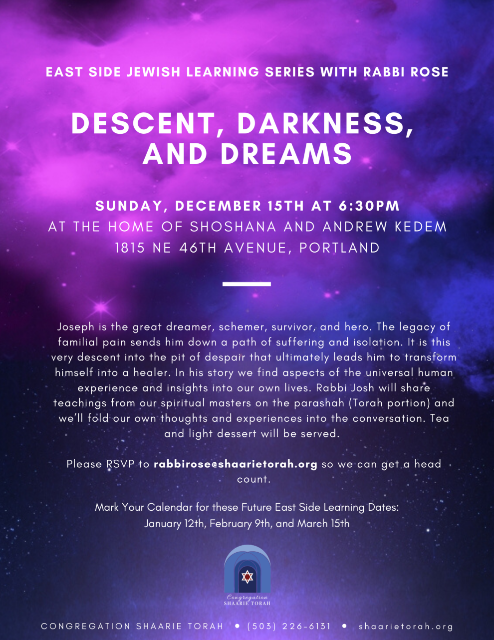 Rabbi Josh will share teachings from our spiritual masters on the parashah (Torah portion) and we’ll fold our own thoughts and experiences into the conversation. Tea and light dessert will be served.