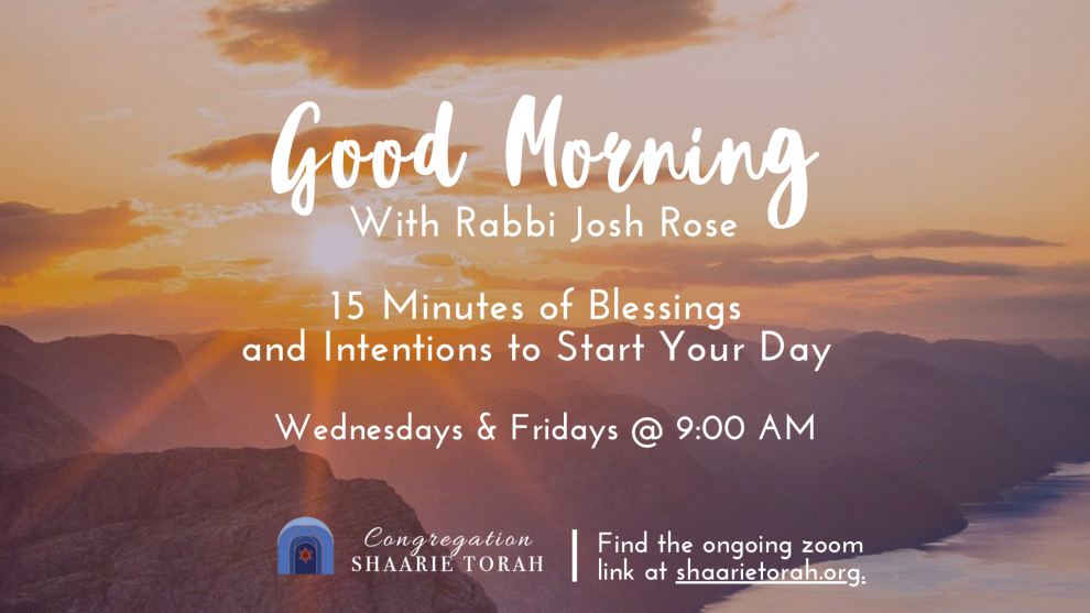 Just like the title says, Rabbi Rose will lead the group through blessings of gratitude, the Shema, the mourner’s Kaddish if we have a minyan, and a Psalm or other reading from the tradition. A beautiful and positive way to start your day.