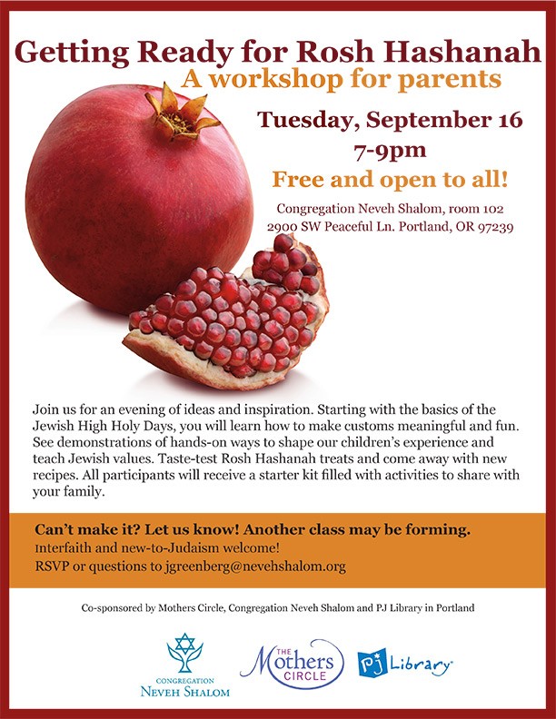 Join us for an evening of ideas and inspiration. We will start with the basics of the Jewish High Holidays and learn how to make customs meaningful and fun. We will see demonstrations of hands-on ways we can shape our children’s experience through the context of Jewish values. Taste-test Rosh Hashana treats and come away with new recipes. Learn how to make Yom Kippur resonate. All participants will receive a starter kit filled with activities to share with your family.