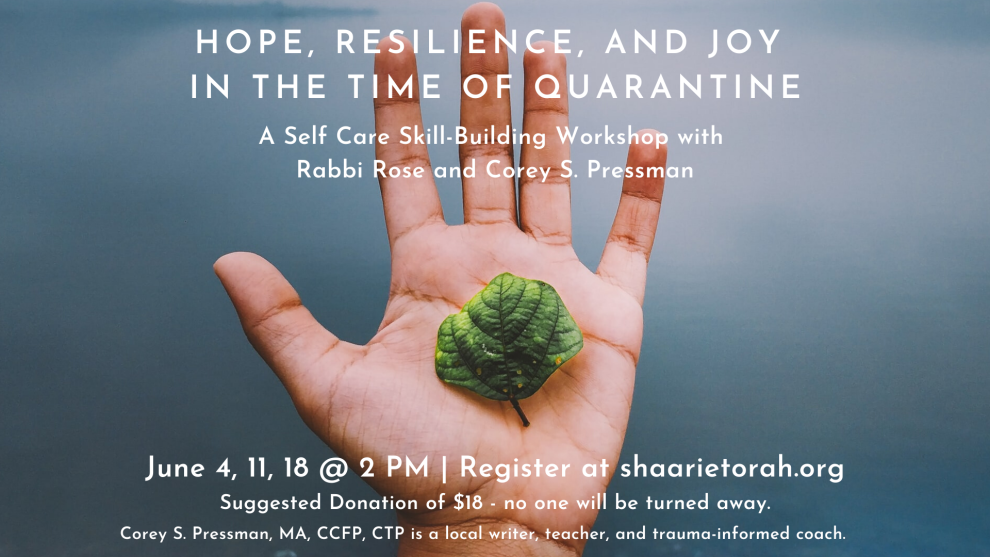 This is a three-class series that focuses on how we can leverage joy and insight to cope with the current crisis and beyond. Rabbi Rose will draw on Jewish teaching and meditative techniques for this series informed by the resiliency framework of local trauma professional Corey S. Pressman.