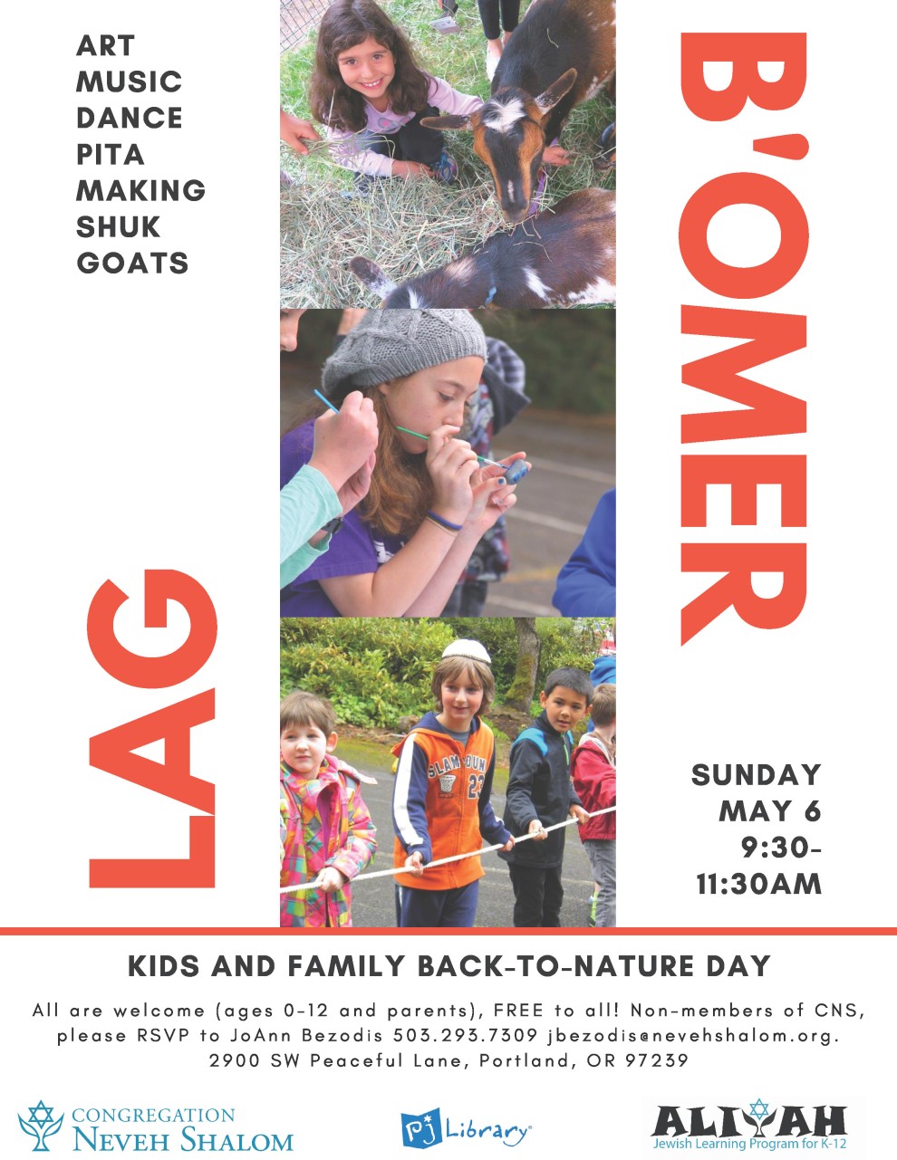 Come to Neveh Shalom for art projects, music & dance, rustic pita making, active games, an Israeli shuk and, of course, goats!