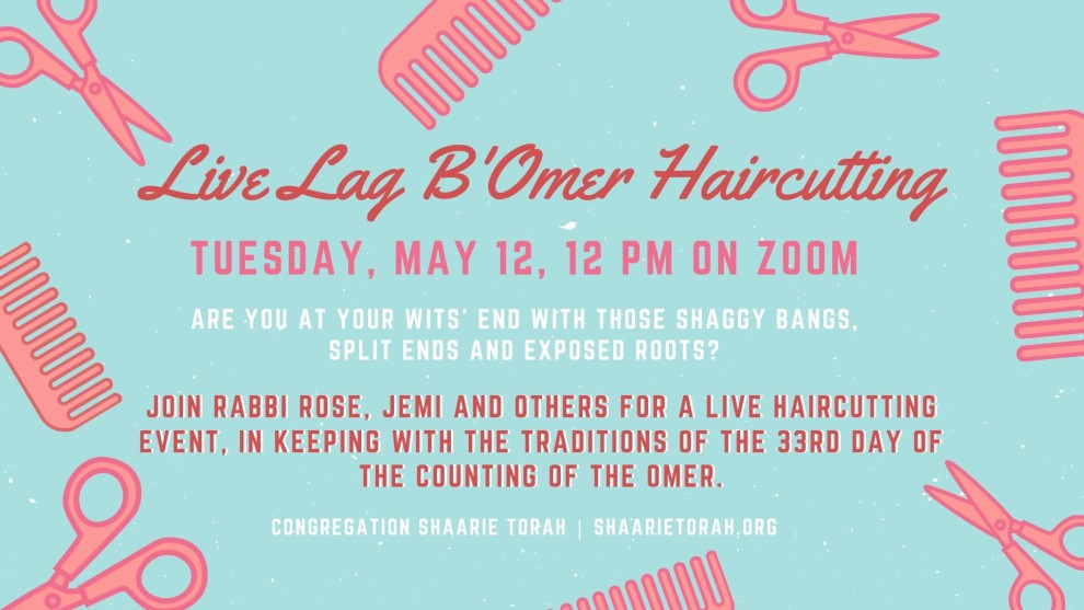 Are you at your wits’ end with those shaggy bangs, split ends and exposed roots? If you’ve reached your limit with Quarantine Hair and are ready to pick up those shears yourself – WAIT! We can help. Join us virtually at noon on Tuesday, May 12th to celebrate Lag B’Omer as CST member and local salon owner Ann Sanderson guides us through the basics of at-home hair care. Join Rabbi Rose, Jemi and special guests: Marc Blattner of the Federation, and the Leeder family, for a LIVE haircutting event, in keeping with the traditions of the 33rd day of the counting of the Omer.