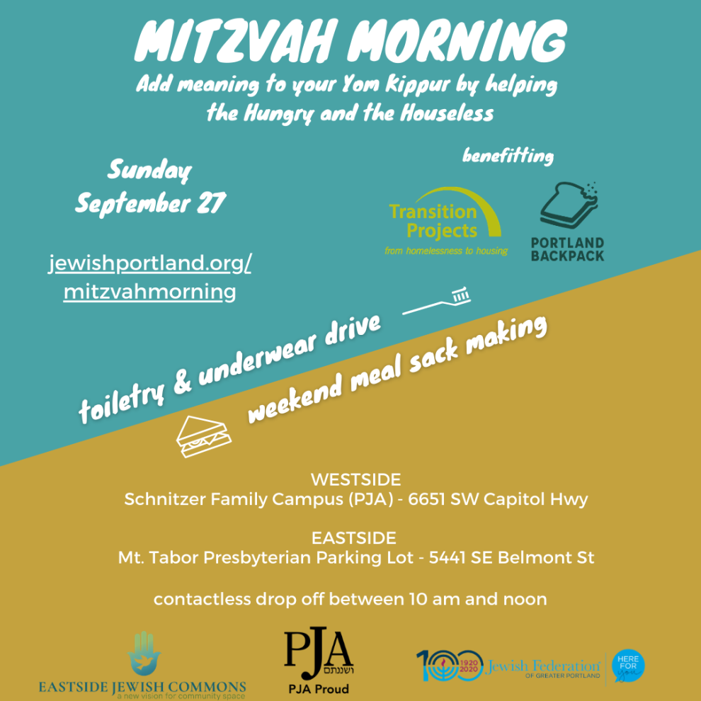 Start 5781 in service of others by making meal sacks and/or collecting toiletries to support those facing food & housing insecurity. Contactless drop-off Sunday morning, September 27, 10 am - 12 noon. Volunteer at home on behalf of the community and make a difference in the lives of others. Register with your commitment and drop off location. Details at: https://www.jewishportland.org/mitzvahmorning