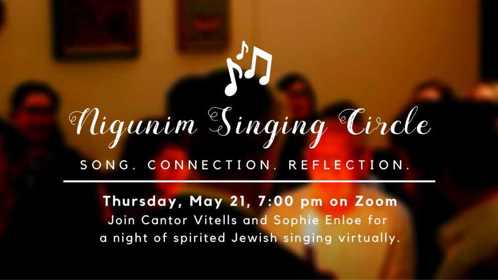Join Cantor Vitells and Sophie Enloe for a soothing evening of melody and song. We'll join together over video, sing some Nigunim, many of which you may know, but some you may not. Though we cannot be together in person, we can fill our homes with beautiful song, connect to ourselves and our voice, and connect to each other.