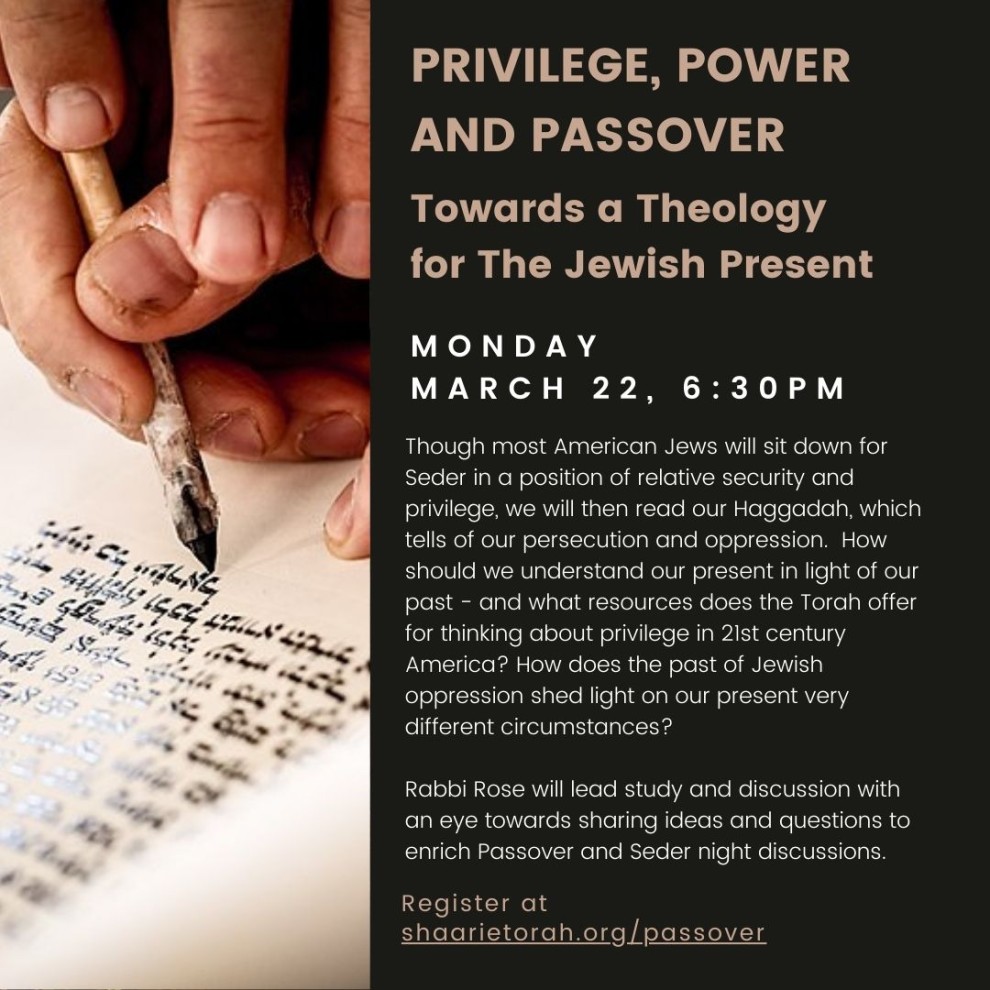 Though most American Jews will sit down for Seder in a position of relative security and privilege, we will then read our Haggadah, which tells of our persecution and oppression. How should we understand our present in light of our past - and what resources does the Torah offer for thinking about privilege in 21st century America? Rabbi Rose will lead study and discussion with an eye towards sharing ideas and questions to enrich Passover and Seder night discussions.
