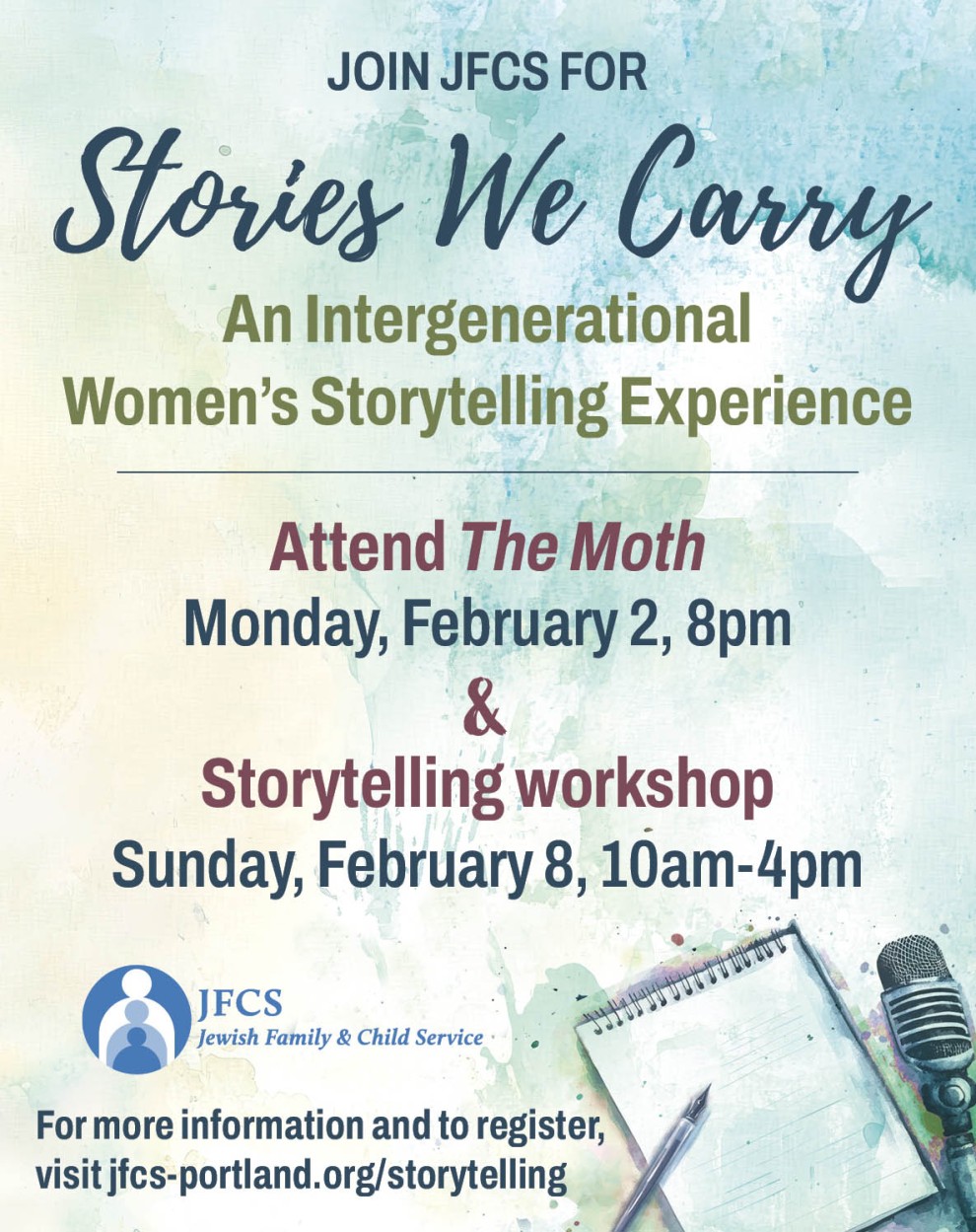 Both events are free but registration is required and space is limited. You must be available to attend both events, as both are integral to the overall experience. For more information and to register: https://www.jfcs-portland.org/storytelling/
