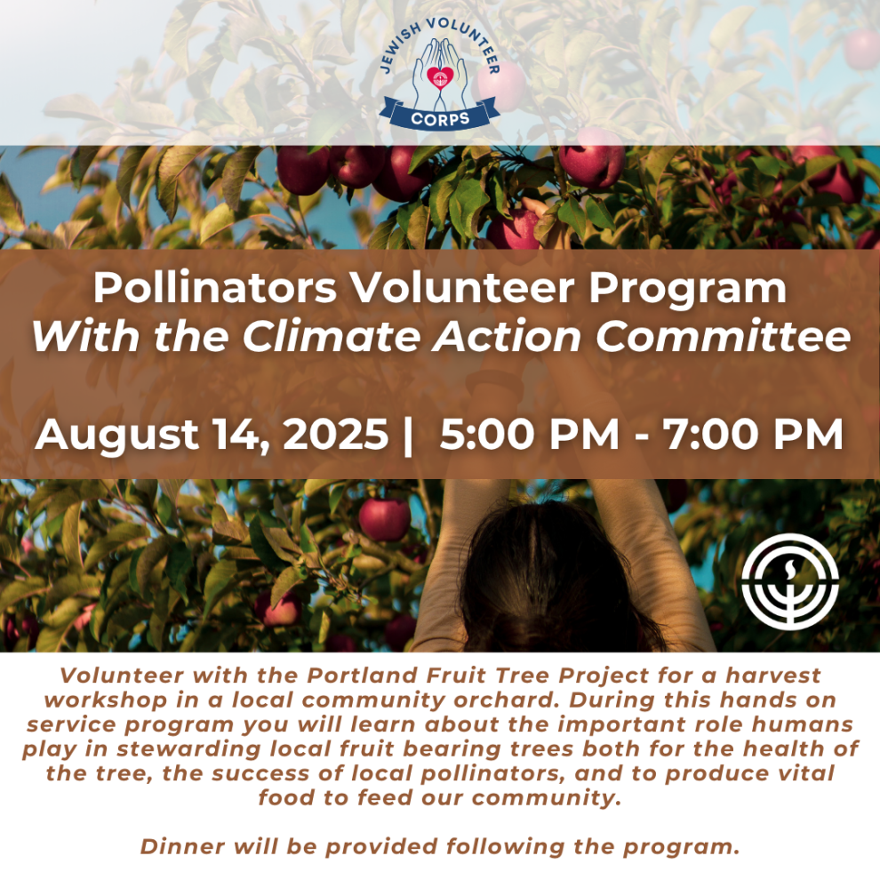 Join the Jewish Federation of Greater Portland's Climate Action Committee for a summer pollinators volunteer program with The Portland Fruit Tree Project. Portland Fruit Tree Project is a grassroots non-profit gleaning organization that provides a community-based solution to a critical and growing need in Portland and beyond: access to healthy food and the benefits provided by trees including clean air, shade, and food. By empowering neighbors to share in the harvest and care of urban fruit trees, they prevent waste, build community knowledge and resources, and create sustainable ways to obtain healthy, locally-grown food.