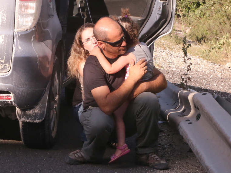 A family shelters by the road in Israel during rocket attacks.