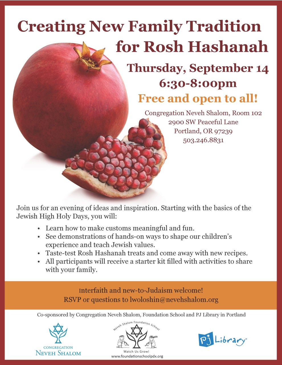 Starting with the basics of the Jewish High Holy Days, you will: learn how to make customs meaningful and fun; see demonstrations of hands-on ways to shape our children’s experience and teach Jewish values; taste-test Rosh Hashanah treats and come away with new recipes; all participants will receive a starter kit filled with activities to share with your family.