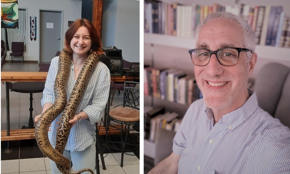PHOTOS: Right: Howie Bierbaum is the new Executive Director of Eastside Jewish Commons.Left: EJC summer intern Alyssa Knudsen hangs out with one of the snakes that visited for snake day at BB Day Camp at the Commons. (See stories on Alyssa and on fall events at bottom of this post.)