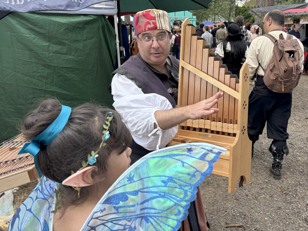 PHOTO: Mistral the Minstrel (Ayal Yariv) assures a young fairy (and her parent) that if one plays the piano, they can play any instrument - including this portative organ - at the Oregon Renaissance Faire in Canby Saturday, June 21. (Jenn Director Knudsen for The Jewish Review)