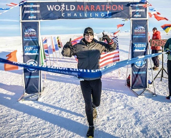 Photo: Jared Blank crosses the finish line in Antarctica, the first of seven marathons he ran on seven continents in seven days.