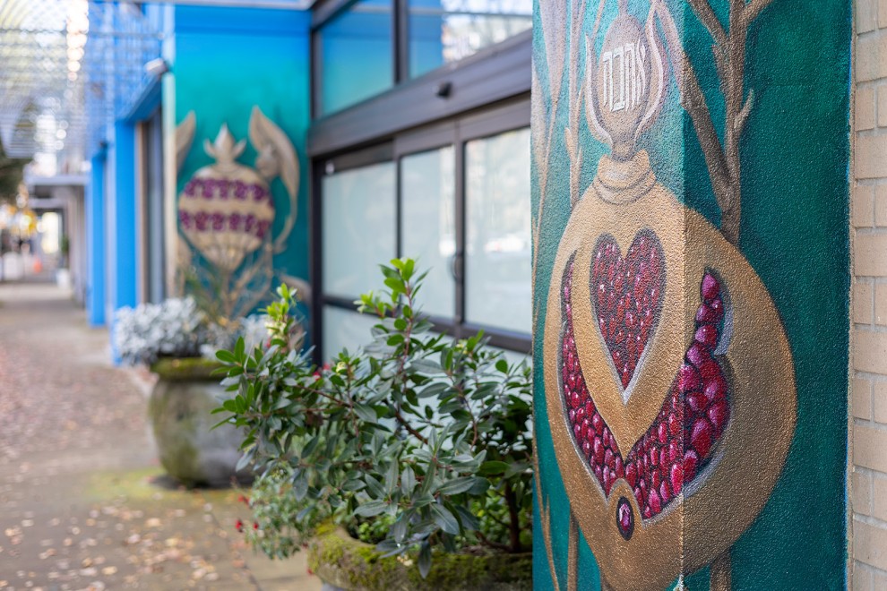 PHOTO: Fahd Sadiq's pomegranate-themed mural adorns both sides of the Eastside Jewish Commons' sliding glass doors. The mural was commissioned in collaboration with local nonprofit Gather:Make:Shelter. (Rockne Roll/The Jewish Review)
