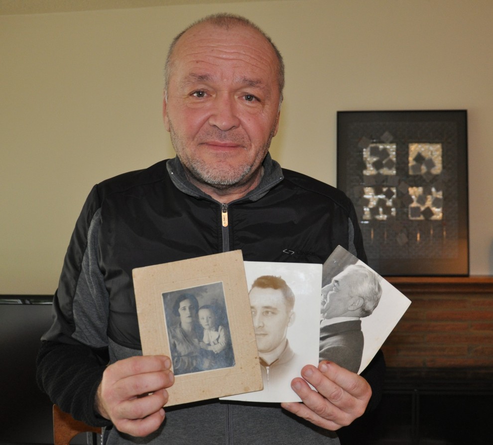 PHOTO: Alex holds photos of his grandmother, father and grandfather, who all survived the Holocaust, though many members of his grandfather’s family perished. Now another war has uprooted his family. They arrived in Portland early this year.