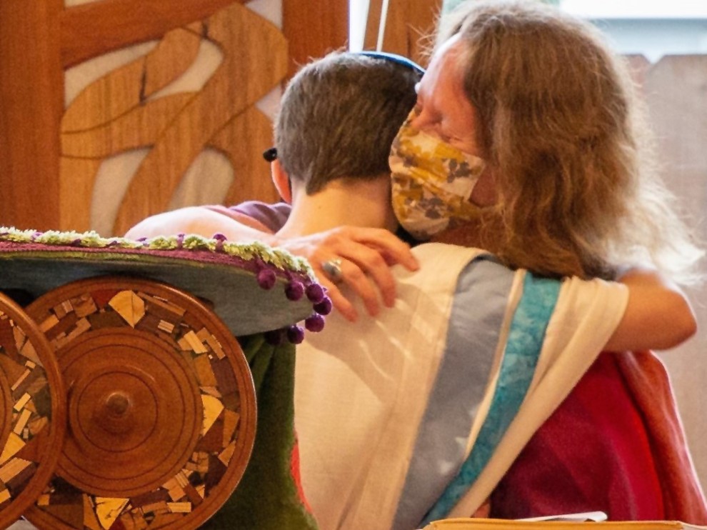 Photo: Gavriel Kedem hugs the scribe of the Torah scroll he read from for his bar mitzvah -- the scribe is his mother, Shoshana Gugenheim Kedem.