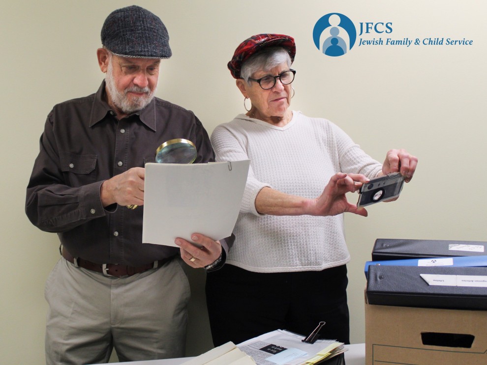 PHOTO: JFCS Board Vice President Bill Treuhaft and wife, JoAnne Treuhaft, carefully comb through JFCS documents, but they need help from you. Photo by Robyn Taylor.