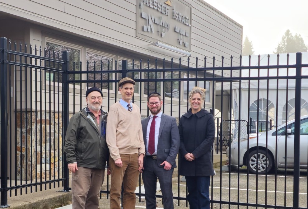 PHOTO: From left, Congregation Kesser Israel Director of Security Aki Fleshler, President Charles Elder, Rabbi Sholom Skolnik and Community Security Director Jessica Anderson show off the synagogue's new perimeter security fence Thursday, Dec. 21. (Courtesy Congregation Kesser Israel)