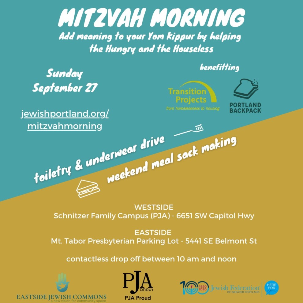 Mitzvah Morning is Sunday, Sept. 27; Yom Kippur begins that evening at sundown. As we enter the new Jewish year, let’s start 5781 off by doing good for others in need. You will assemble and collect these items IN YOUR HOME and do a socially distant, drive-through drop-off in either Southwest or Southeast Portland.