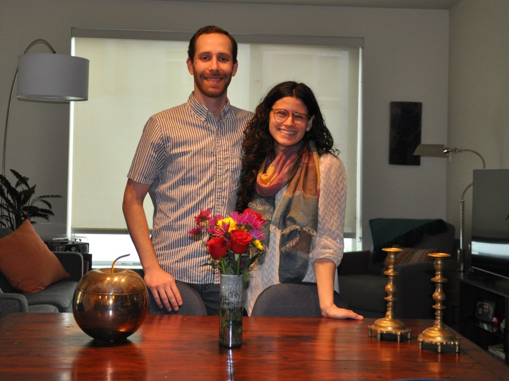 PHOTO: Owen Broder, 32, and Shelly Zeiser, 29, plan to host many events for young adults in their Pearl District apartment (see upcoming events below). The couple are flanked by heirlooms from their grandmothers. The apple ice bucket belonged to Owen’s grandmother. The Shabbat candlesticks came from Russia through Ellis Island with Shelly’s great-grandmother, and Shelly remembers lighting them with her grandmother.