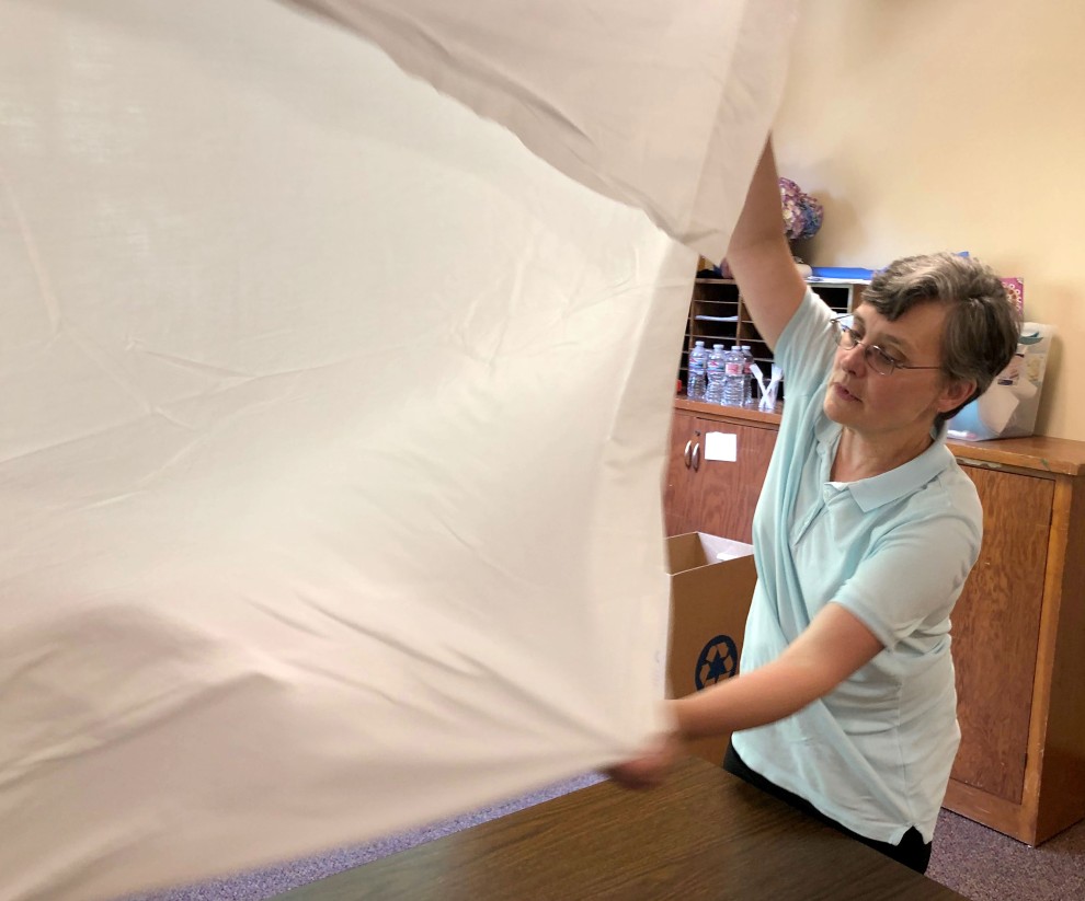 PHOTOS: Shroud crowd: Sandy Axel, left, assesses donated fabric to check it for holes, stains, tears, etc. before it can be cut into tachrichim components.