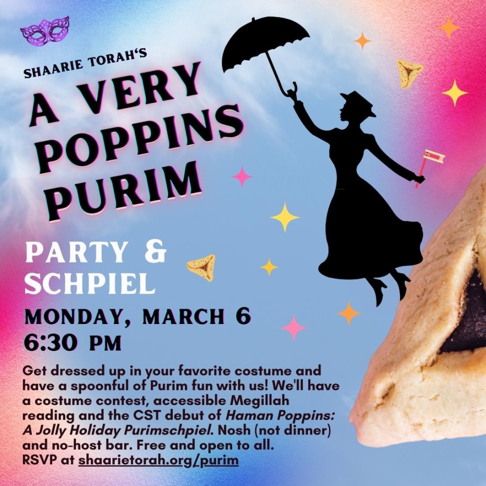 Join us for a very fun and lively costume contest, accessible Megillah reading and the CST debut of Haman Poppins: A Jolly Holiday Purimschpiel (directed by Jemi, staring Keith Berne, Ya'ara Oren, Cara, Rabbi and more!) Nosh (not dinner) and no-host bar. Free and open to all. Stay tuned for info about a possible raffle. RSVP here: https://shaarietorah.wufoo.com/forms/mmavqf70kvwl1i/