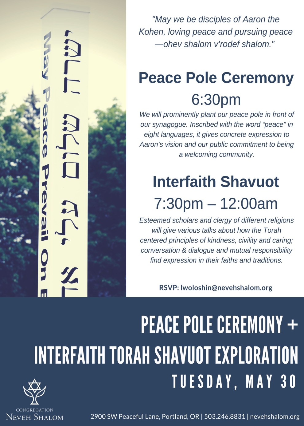 6:30pm - Peace Pole Planting Ceremony - We will prominently plant our peace pole in front of our synagogue. Inscribed with the word “peace” in eight languages, it gives concrete expression to Aaron’s vision and our public commitment to being a welcoming community.