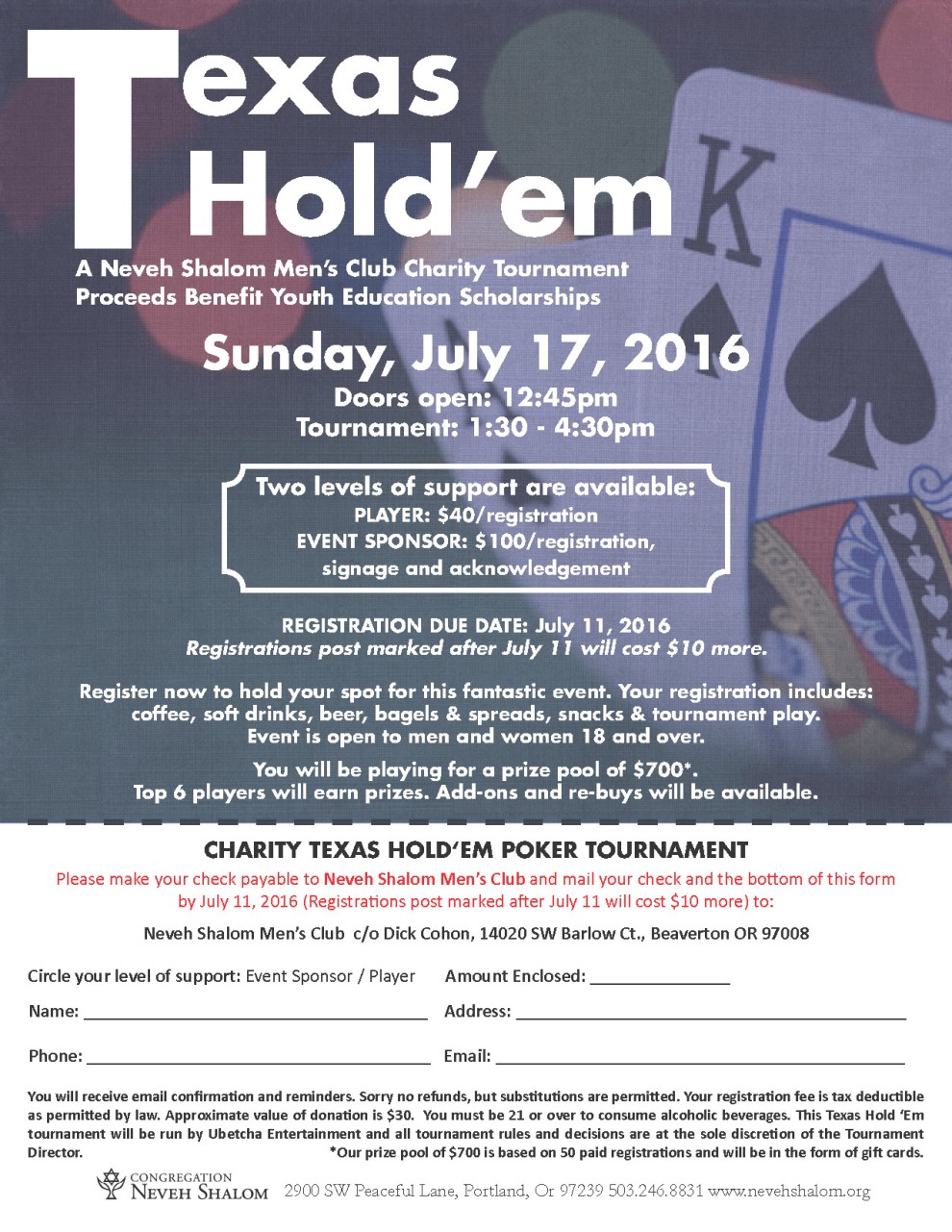 Bring your poker face for a Texas Hold’em Tournament w/ Men’s Club. Register now to hold your spot for this fantastic event. Your registration includes: coffee, soft drinks, beer, bagels & spreads, snacks & tournament play. Event is open to men and women 18 and over. You will be playing for a prize pool of $700 (based on 50 paid registrations and will be in the form of gift cards). Top 6 players will earn prizes. Add-ons and re-buys will be available. Doors open at 12:30 pm.