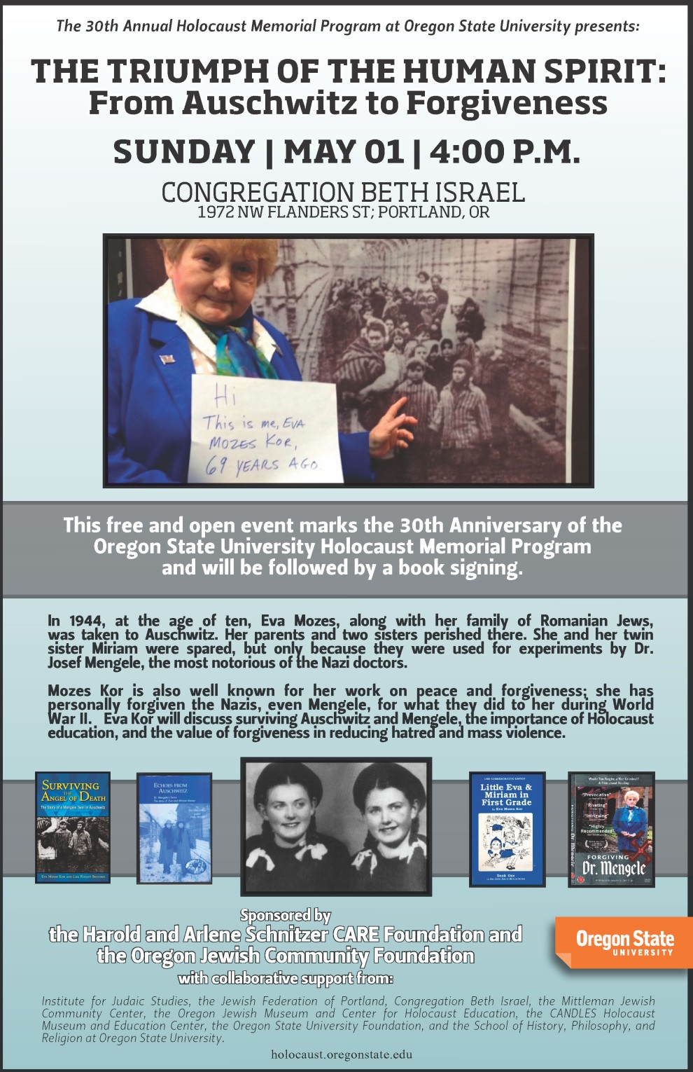Co-sponsors include: Oregon State University: School of History, Philosophy, and Religion, Jewish Federation of Portland, Congregation Beth Israel, Oregon Jewish Community Foundation, Oregon Jewish Museum and Center for Holocaust Education, and the CANDLES Holocaust Museum and Education Center.