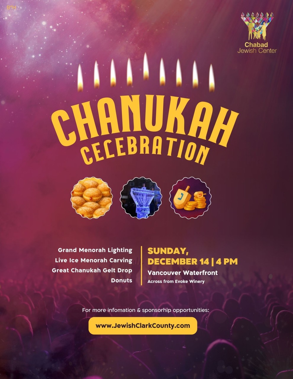 Chabad Jewish Center will celebrate the first night of Chanukah with the lighting of the 19-foot Grand Menorah at the Waterfront (near Evoke Winery). Enjoy free donuts, festive music, a live ice carving of a menorah, and—for the children—chocolate gelt dropped from the sky!