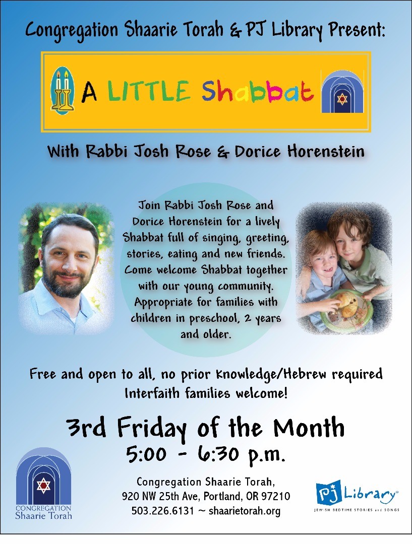 Join Rabbi Josh Rose and Dorice Horenstein for a lively Shabbat full of singing, greeting, stories, eating and new friends. Come welcome Shabbat together with our young community. Appropriate for families with children in preschool, 2 years and older.