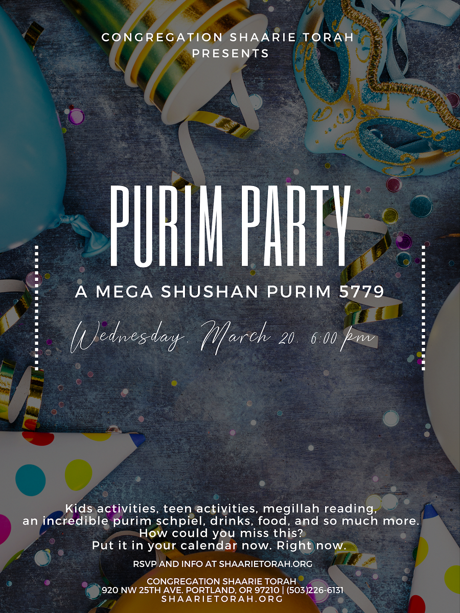 Wednesday, March 20, 6:00 PM (Kids Purim Service) | 6:30 PM Party starts | FREE & OPEN TO ALL