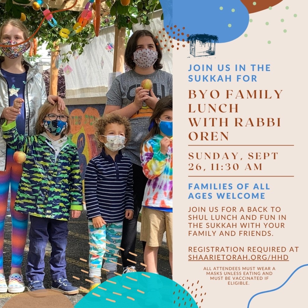 Bring your lunch and your family for a fun and festive lunchtime get together in our Sukkah!! All ages welcome. We'll celebrate coming back to Shul for Religious School and starting 5782 together. All attendees must be masked at all times unless eating or drinking and fully vaccinated if over 12 yrs old and eligible. Registration required, use link: https://shaarietorah.wufoo.com/forms/m49dy8r0omgiv1/