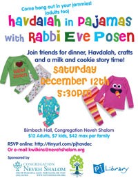 Enjoy a kid friendly dinner, Havdalah, crafts and a milk and cookie story time. What wacky pajamas will Rabbi Eve wear? Find your favorite footies (adults too!) and get ready for the perfect family night with wee ones.