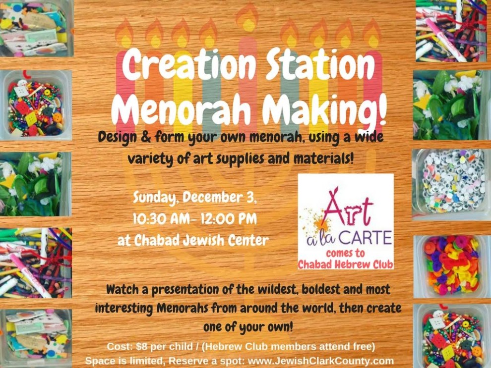 Creation Station presented by Art a la Carte. Watch a presentation of the wildest, boldest and most interesting Menorahs from around the world, then create one of your own!