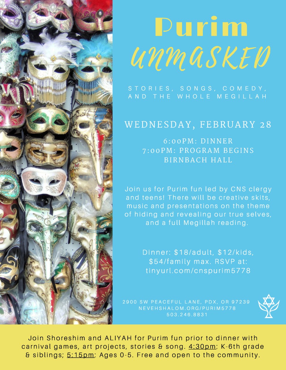 Join Shoreshim and ALIYAH for Purim fun prior to dinner with carnival games, art projects, stories & song.