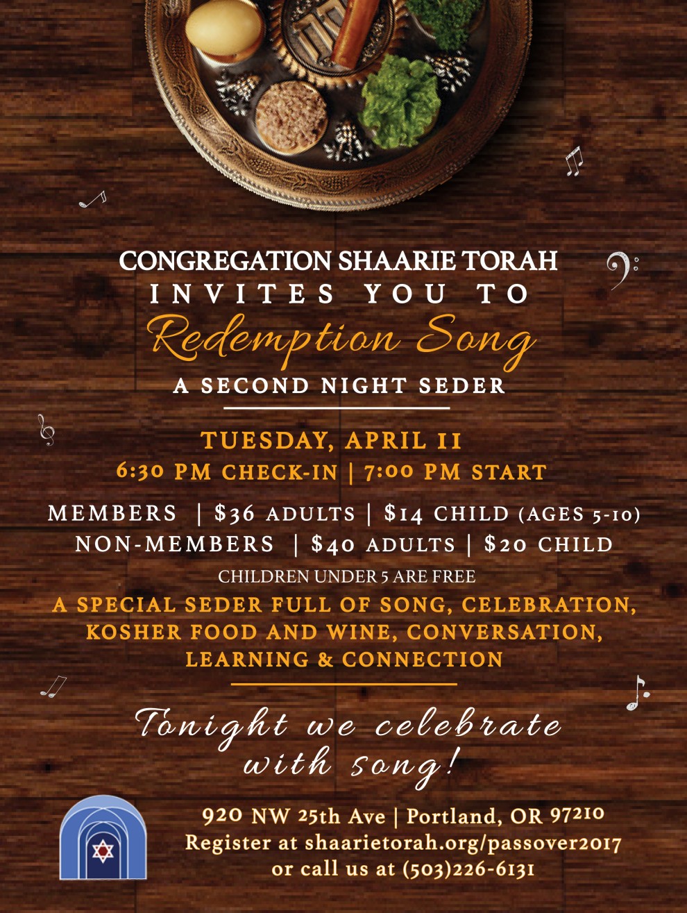 Deadline for reservations is April 7th / Visit our website at shaarietorah.org or call our office to RSVP at (503)226-6131