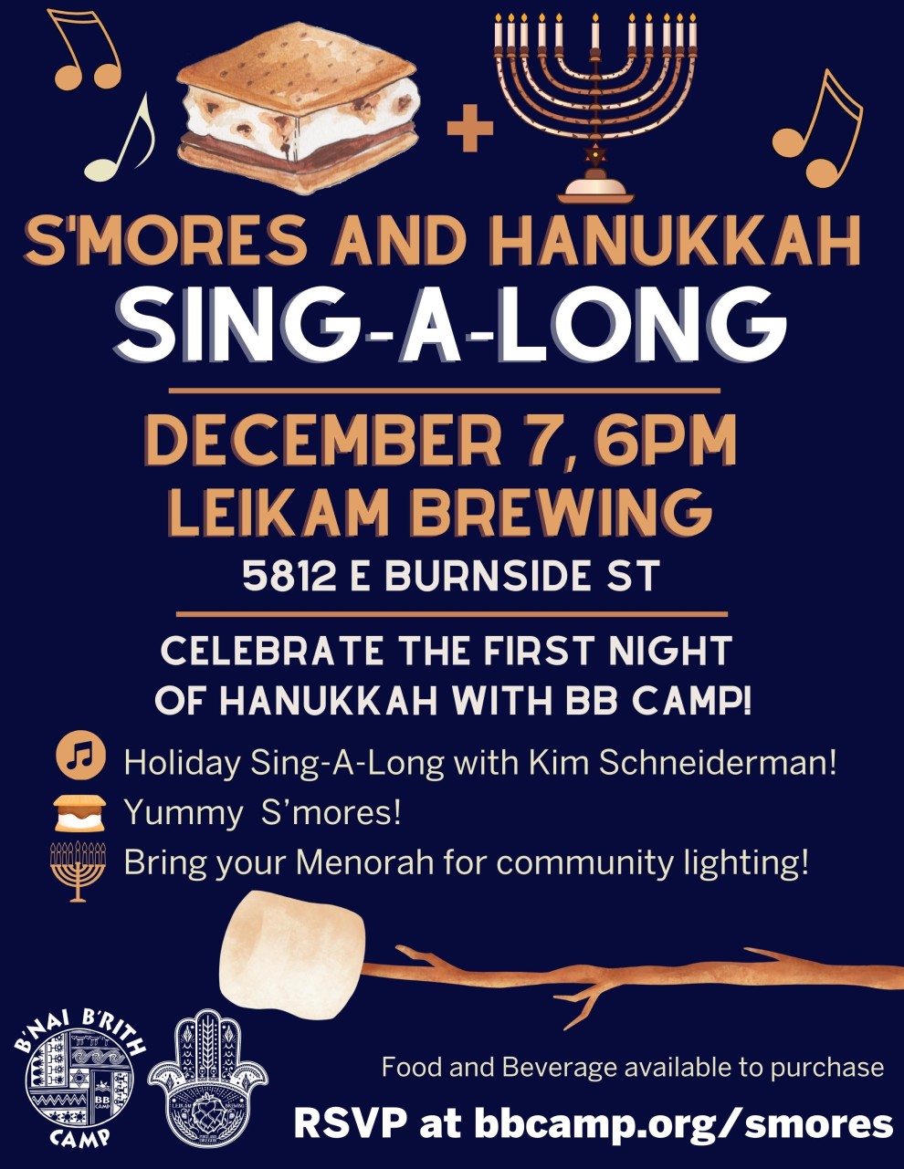 Celebrate the first night of Hanukkah with BB Camp at Leikam Brewing. Holiday sing-a-long with Kim Schneiderman, delicious Smore’s around firepits, and a community lighting of the first candle (bring your menorah if you’d like!)