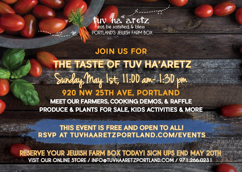 Come learn about Portland's Jewish Farm Box and how you can get a box of fresh vegetables and more delivered to your neighborhood this summer! This event is free and open to the public! Farm-fresh lunch, raffle & great prizes, kids activities, starts for your garden, meet farmers & local Jewish businesses and listen to a short panel on "What Food Can Teach Us". Visit our website to RSVP and find out more: tuvhaaretzportland.com/events