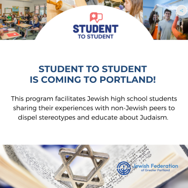 Student to Student is coming to Portland! This program facilitates Jewish high school students sharing their experiences with non-Jewish peers to dispel stereotypes and educate about Judaism